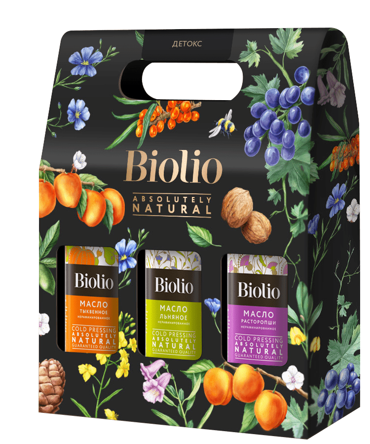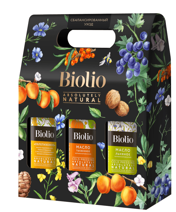 В наборе три растительных масла: облепиховое, льняное и тыквенное. Антиоксиданты в масле из облепихи помогают снизить риск недугов, связанных с сердцем или сосудами. Льняное масло налаживает работу нервной системы благодаря жирным кислотам омега-3. Тыквенное масло насыщает организм витаминами, А и Е. Этим элементам точно порадуются глаза и кожа.