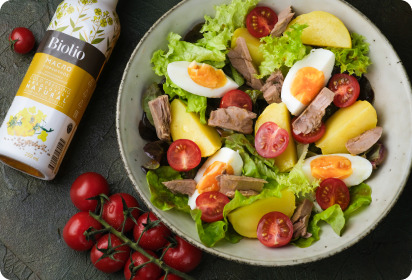 Салат из салатной смеси, перепелиных яиц, томатов черри, тунца и заправки из расторопши