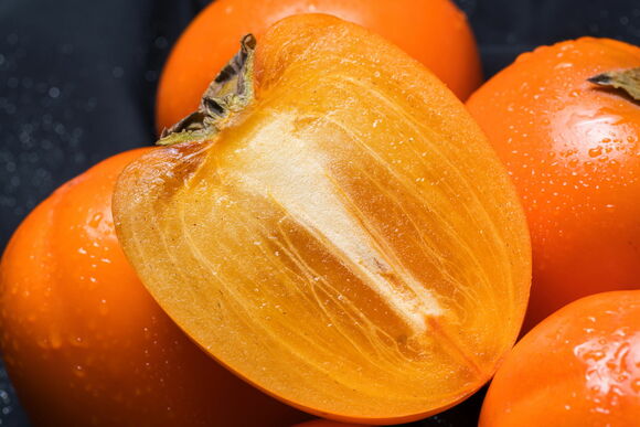 - Мякоть спелой хурмы имеет яркий янтарный или слегка коричневатый цвет в зависимости от сорта. Она может быть слегка прозрачной.