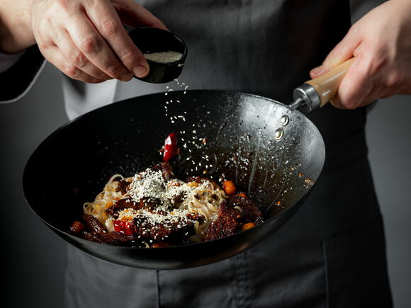 Главное отличие профессионального вока от обычной сковороды — тонкие стенки толщиной 2 мм и сферическое дно, благодаря чему с воком удобно работать: просто приподняв его с огня, можно изменить температуру приготовления.