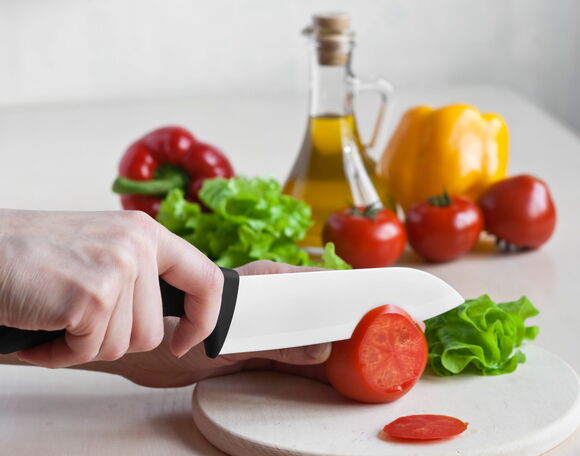 - Проверка на томате. Если нож без сильного давления не может отрезать тонкий ломтик от помидора — пришло время его подточить.