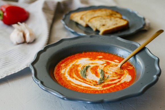 Юлия Высоцкая предлагает взять за основу супа запеченные томаты и другие овощи-помощники. В предварительно разогретую духовку выкладывают нарезанные помидоры, морковь, лук и чеснок. Затем запекают 25 минут при 180°С. А в конце взбивают в блендере с горячим бульоном. Изюминка этого блюда — в гренках, которые выкладывают на дно суповых тарелок, перед тем как разлить в них ароматный суп.