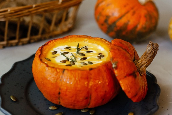 Негласный король всех супов-пюре — тыквенный, именно он пользуется наибольшей популярностью. Можно подготовить такое угощение прямо в самой тыкве. Для этого мякоть обжаривают с луком и чесноком и варят до готовности около 20 минут. Пюрируют, добавляют сливки и ароматные специи. В это время небольшую тыкву запекают 30–40 минут при 180°С. Готовый суп заливают внутрь и подают к столу.