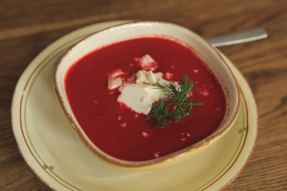 Суп-пюре со свеклой от Юлии Высоцкой получается нежным и легким: он не сказывается на фигуре, но при этом хорошо утоляет голод. Для начала подготавливают и обжаривают лук, морковь и сельдерей. К ним добавляют дольки свеклы и твердых яблок, да-да! Варят до готовности на курином бульоне и пюрируют в блендере. А готовый суп украшают кусочками козьего сыра.