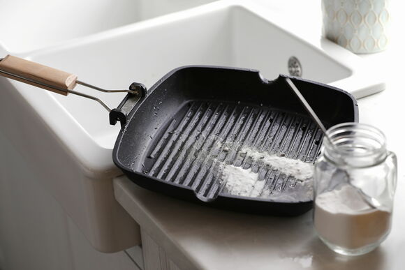 Достаньте посуду и уберите нагар скребком или специальной металлической губкой.