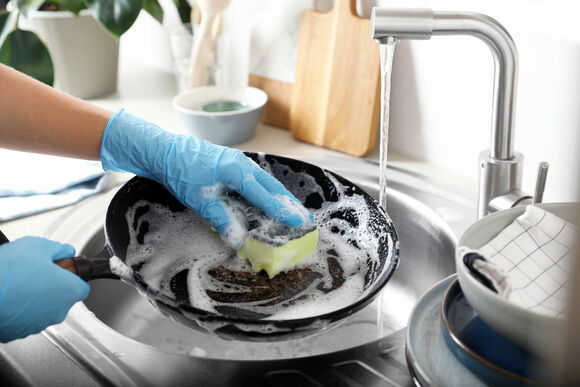 Для этого вскипятите в большой емкости воду, добавьте достаточное количество жидкости для мытья посуды или кухонного жидкого мыла (2–3 ст. л. на 1 л воды). Наденьте перчатки и вспеньте жидкость. Поместите сковороду в емкость и оставьте на несколько часов. После этого удалите нагар с использованием специального скребка из пластмассы.