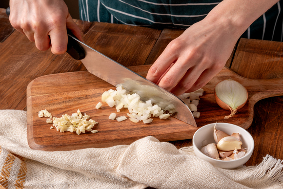 - Лук и чеснок очистите от шелухи и мелко нарежьте.