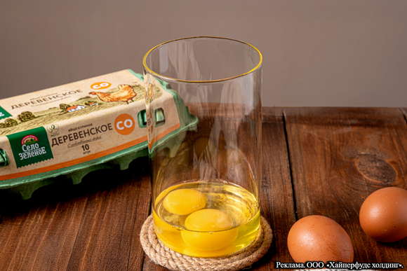 - Сырые куриные яйца «Село Зелёное» разбейте в высокую емкость с небольшим по диаметру дном. Это может быть стакан для блендера или банка. Желательно, чтобы желтки остались целыми.