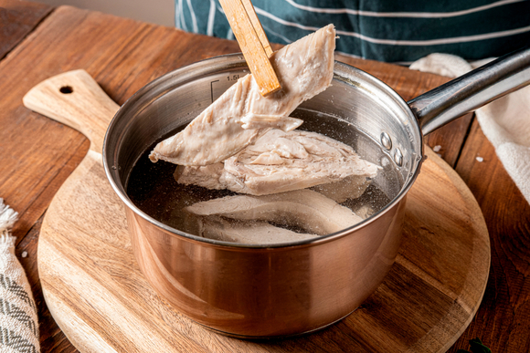 - В небольшой кастрюле вскипятите воду, посолите. Добавьте куриную грудку и варите 25–30 минут. Достаньте по готовности и дайте остыть.