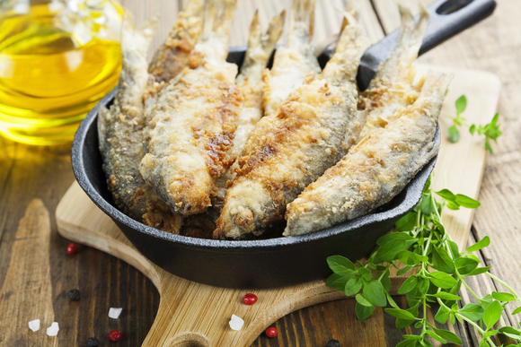 Жарить рыбу всегда лучше в панировке из муки, иначе хрустящей поджаристой корочки не получится, а рыба прилипнет к сковороде намертво, сколько бы масла вы ни налили. В большую миску насыпается мука, и куски рыбы обваливаются в ней со всех сторон. Некоторые хитроумные хозяйки насыпают муку в полиэтиленовый пакет, и по одному опускают туда кусочки рыбы. Так и рыба будет запанирована в муке, и кухня останется чистой. Куски рыбы должны быть не слишком толстые, иначе рыба в середине не прожарится, а снаружи подгорит. Мелкую рыбешку резать не нужно – ее жарят целиком. Панировать можно и по-другому: сначала окунуть кусок рыбы в яичную смесь (взбитое яйцо и пара ложек молока), и лишь затем обвалять его в муке.