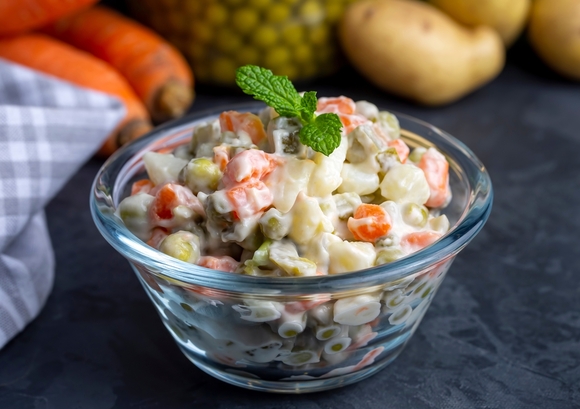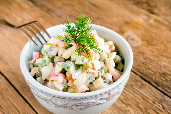 В прошлом салат оливье ассоциировался с достатком, поэтому хозяйки обязательно готовили эту закуску к новогоднему столу. Пошаговый рецепт классического оливье выглядит очень просто. Сначала отваривают в кожуре картофель и варят вкрутую яйца, а когда продукты остынут, очищают их и режут кубиками. Соленые огурцы с отрезанными хвостиками нарезают брусочками, отварное мясо (говядину, курицу, индейку) измельчают, из банки горошка сливают жидкость, репчатый лук мелко шинкуют. Все ингредиенты смешивают в салатнике и заправляют майонезом. Несмотря на то что классический оливье готовят именно с мясом, как это было в изначальном рецепте французского кулинара, докторскую колбасу также можно считать вариантом классики.