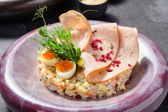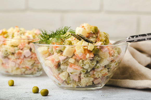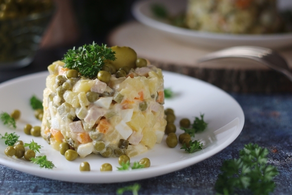 Классический салат оливье с мясом — еще один символ Нового года, который нам привычно видеть на праздничном столе. Но мало кто знает, что автор этого блюда — французский повар Люсьен Оливье, открывший в середине XIX века в Москве ресторан «Эрмитаж». Его фирменная закуска оливье из мяса куропаток и рябчиков, с языком молодого теленка, раковыми шейками и прослойкой желе из бульона собирала в ресторане гурманов со всей столицы. Мясное лукошко заполнялось отварным картофелем, яйцами, корнишонами, каперсами, оливками и заливалось вкуснейшим майонезом, сделанным по уникальному авторскому рецепту. Многие пытались узнать настоящий французский рецепт классического салата оливье, но Люсьен держал свои хитрости в секрете. Со временем русские повара адаптировали заморскую закуску под нашу действительность, а в советские времена появился рецепт оливье с вареной колбасой, который мгновенно прижился и стал популярным. Интересно, что современный оливье потерял свои французские корни и за рубежом известен как «русский салат».