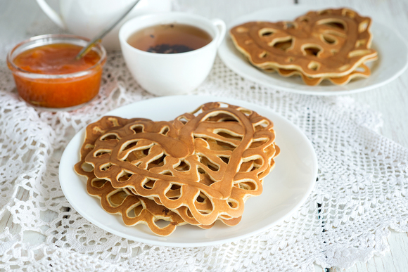 - Очень красиво и романтично выглядят сердечки с завитушками. Для детей можно нарисовать что-то более интересное и забавное, чтобы повысить аппетит. Кружевные блинчики можно подать очень красиво и оригинально, например, украсив дырочки ягодами.
