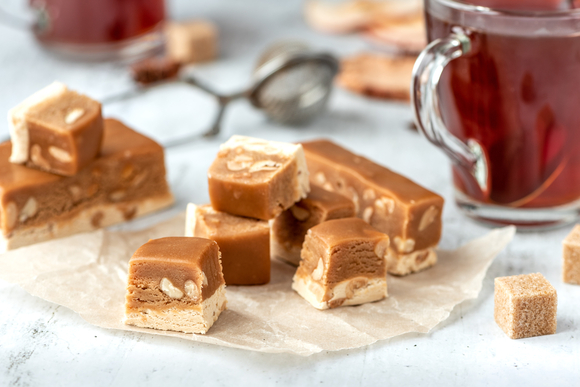 Смешиваем 250 г сахара с 1 ч. л. сиропа из кукурузы, 230 г сливочного масла и солью на кончике ножа. Варим 5 минут на медленном огне, добавляем 90 г молотого жареного миндаля и продолжаем держать массу на огне, пока она не уварится и не станет нежно-коричневой. Выливаем помадку в промасленную форму, даем застыть и нарезаем на кусочки. Англичане подают этот десерт к традиционному «файф-о-клок» вместе с бисквитами и вареньем.
