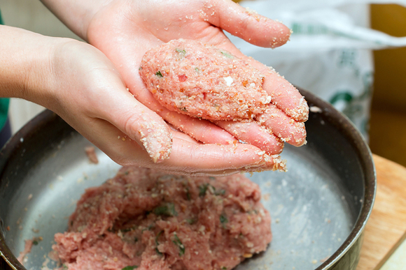 Недостаточно просто смешать нужные ингредиенты, даже если они очень качественные. По классическому рецепту пожарских котлет с фото мясной фарш очень хорошо вымешивают, как месят тесто, собирая его в комок и превращая в пласт в течение продолжительного времени, ведь чем дольше длится вымешивание фарша, тем сочнее он получится. В процессе вымешивания фарш нужно солить и перчить по вкусу. Повара также рекомендуют завернуть мясо в пищевую пленку и несколько раз ударить им со всей силы по столу.