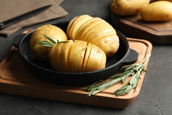 «Картошка-гармошка» украсит любое застолье или будничный ужин. Сделайте на клубнях глубокие поперечные надрезы, заполните их салом, беконом, сыром или овощами по вашему вкусу и запеките в духовке. Палочки для еды или бамбуковые шпажки помогут сделать разрез не до конца. Поместите между ними картофель, сделайте прорези острым ножом, слегка раскройте их и поместите внутрь начинку.
