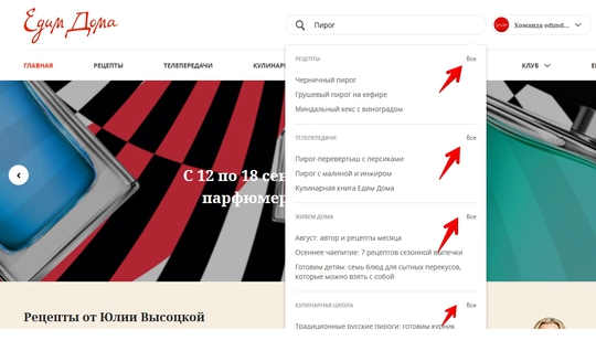 Кроме того, строка поиска есть в каждом разделе. То есть вы можете предварительно выбрать раздел и уже в нем найти необходимую публикацию: рецепт, статью, совет.
