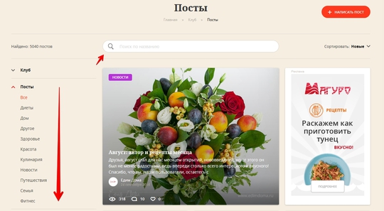 В разделе «Клуб» вы можете осуществлять поиск по постам (по всем постам — выбираем фильтр «Все», в конкретной рубрике — выбираем рубрику в меню фильтров).