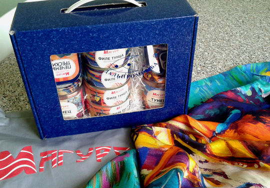Набор консервов из восьми банок, которые почти сразу пошли в дело, фирменный фартук и платок. Всё очень достойно. Из консервов уже знакомый тунец и печень трески, но о ней позже. ☺