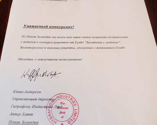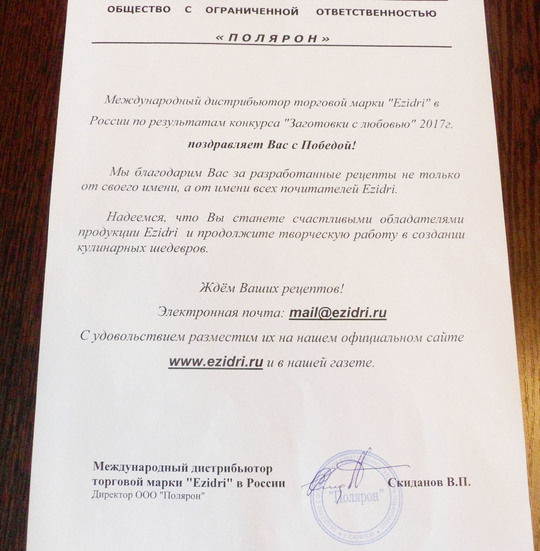 Добрый день, уважаемые посетители сайта «Едим Дома»! Хочу обратиться со словами благодарности к спонсору конкурса «Заготовки с любовью», международному дистрибьютору торговой марки Ezidri в России за прекрасные подарки, к команде сайта «Едим Дома» за отличную организацию конкурса, ко всем едимдомовцам за душевную поддержку сердечками и добрыми словами комментариев. Огромное спасибо всем! Также хочу поблагодарить менеджера компании «Полярон» Светлану Гусынину за высокую оперативность и точность в работе с клиентом, благодаря ей посылка дошла до меня очень быстро.