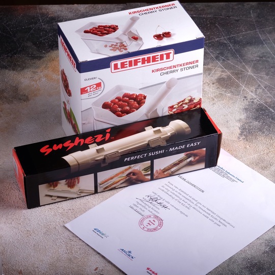 2. Конкурс от компании Ezidri. В этом конкурсе я получила поощрительный приз за рецепт вяленых томатов — устройство для изготовления роллов (раньше я даже не знала, что такие устройства существуют) и специальный гаджет (думаю, именно так уместно его назвать) для отделения косточек из вишен.