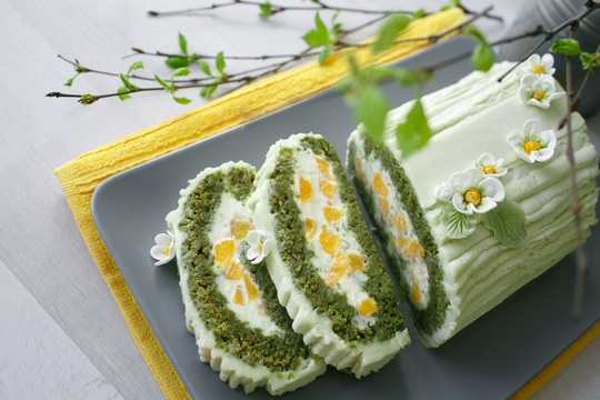 Вот наш рулет-победитель «Герр Март» с персиками, лаймом и чаем матча. Всегда, когда смотрю на него, вспоминаю весну и персики ТМ «Фрау Марта»)