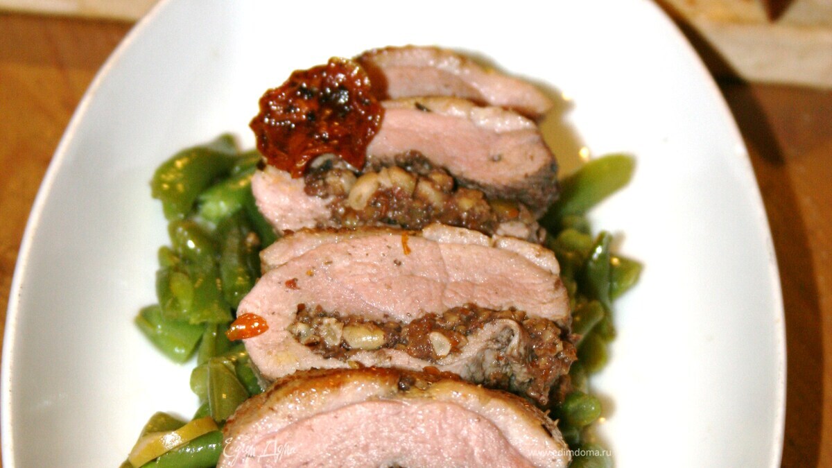 В грудках ножом сделать «карманы» между кожей и мясом и заполнить их фаршем. Для начинки пропустить через мясорубку или мелко нашинковать орехи, томаты и маслины с оливками. Вместо оливок можно взять каперсы. Солить не стоит, так как соль уже есть в оливках.
