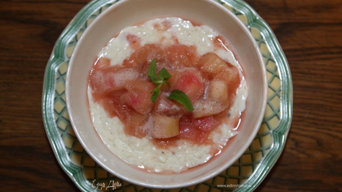 Выложить кашу в пиалу, а сверху — отваренные кусочки ревеня.