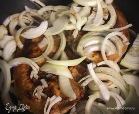 Добавить лук, обжарить.