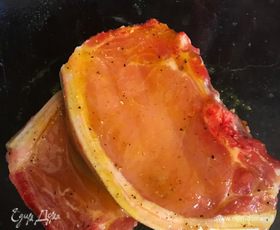 Натереть свинину солью и перцем. Смешать мед и горчицу, полить отбивные. Поставить в холодильник на 1 час или дольше.