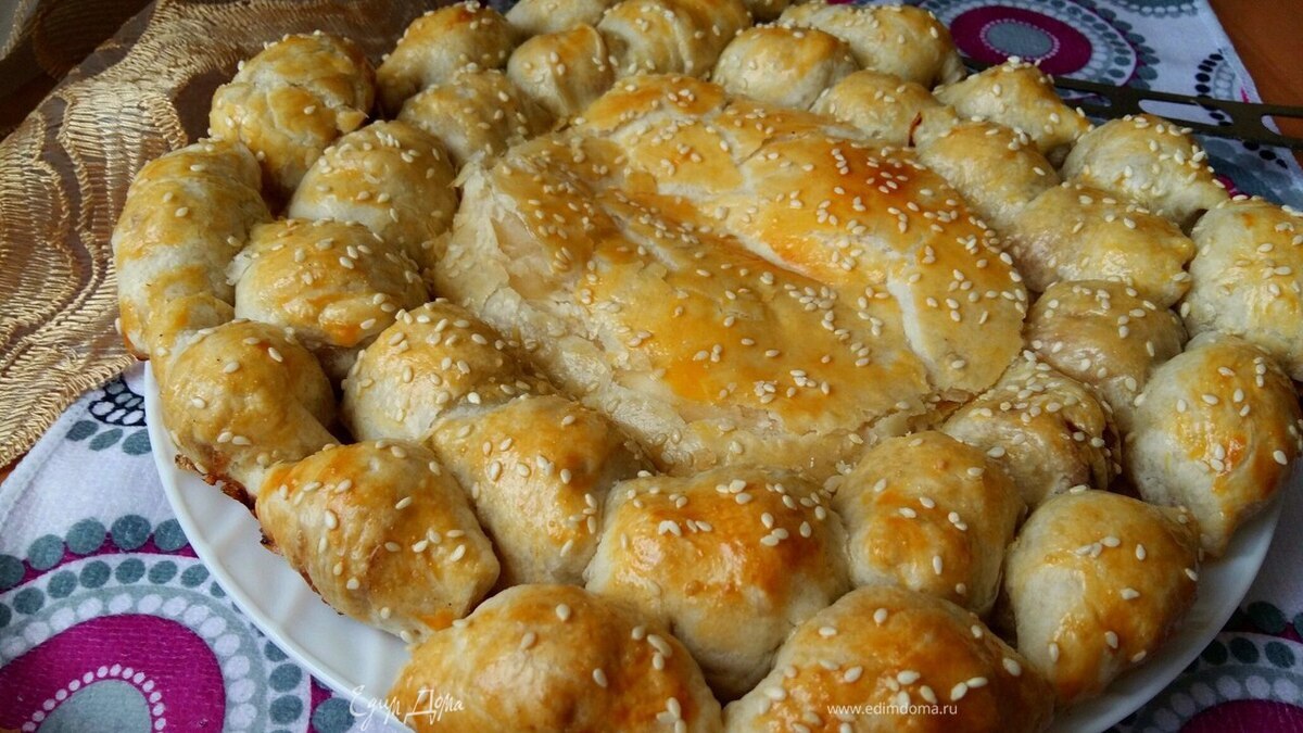 Взбиваем желток и смазываем пирог, посыпаем кунжутом. И отправляем в разогретую духовку при 180°С на 40 минут до зарумянивания. - Шаг 10
