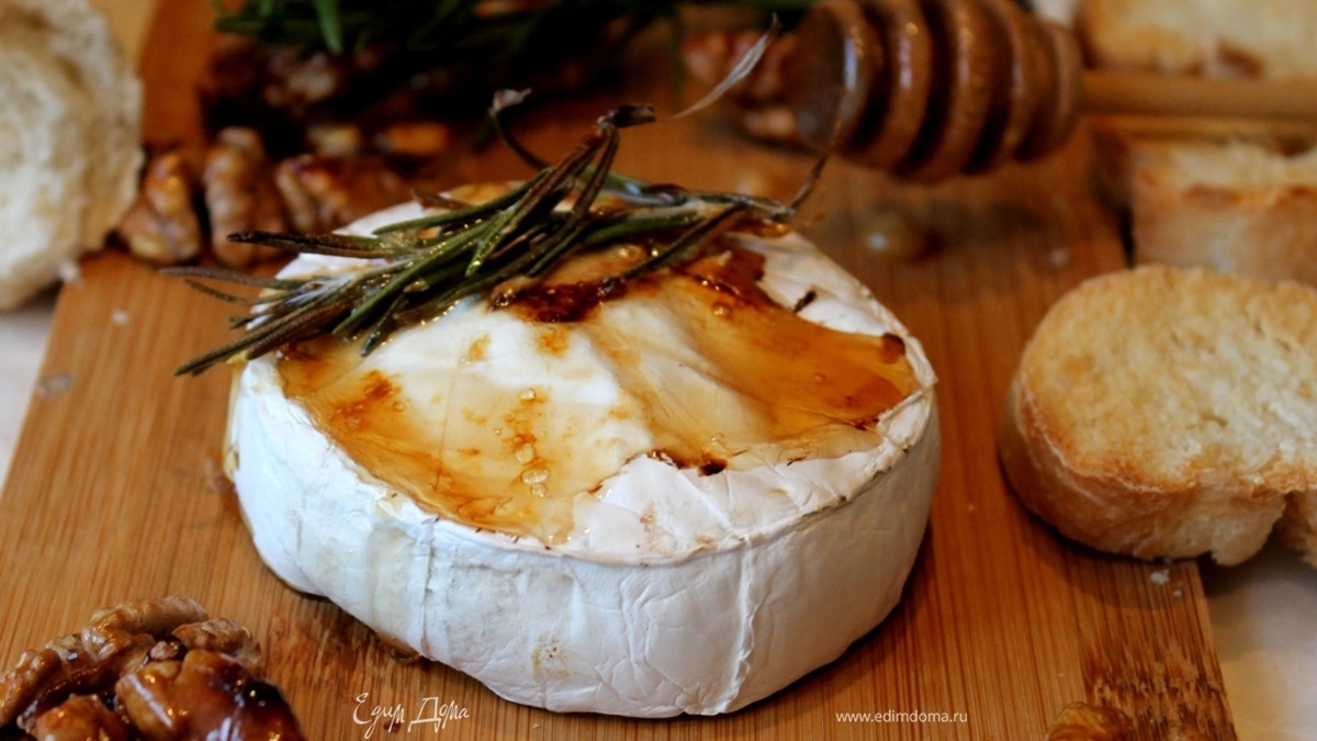 Спустя 15 минут, когда вы почувствуете, что сыр внутри стал мягким, а мед начал превращаться в карамель, аккуратно перенесите его на дощечку, разложите карамелизированные орехи и ломтики багета.