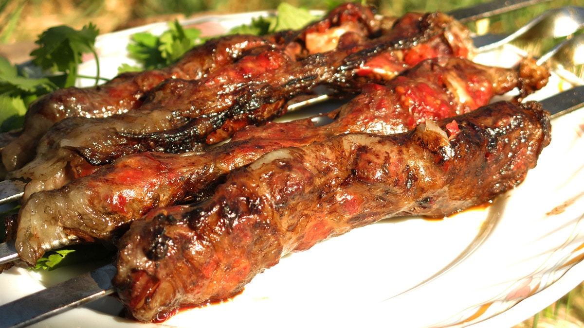 Бараньи почки — редкий субпродукт, его главное отличие и беспорное достоинство — практически отсутствие специфического запаха, характерного для говяжьих и свиных почек. Увидела бараньи почки на прилавке впервые, и сразу в голове закрутились блюда, а еще и наконец-то найденная жировая сетка вмешивалась в рецепты, конечно, такой «деликатес» был приобретен. Подобрать какой-то один рецепт не получилось. Состав шашлыка «сборная солянка», почки в маринаде на основе сладкого перца, завернуты в сетку в виде кебаба. Приятного аппетита!