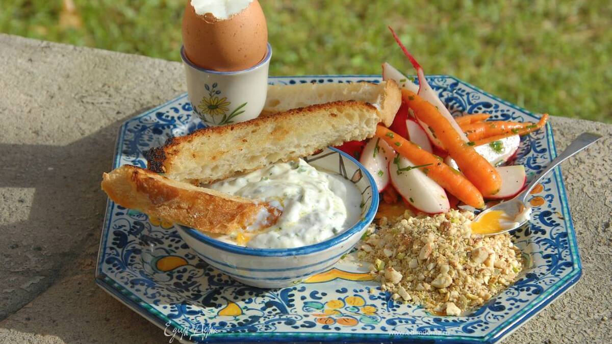 Подавать яйца со сметанной заправкой, ореховой крошкой, замаринованными овощами и хлебными палочками.