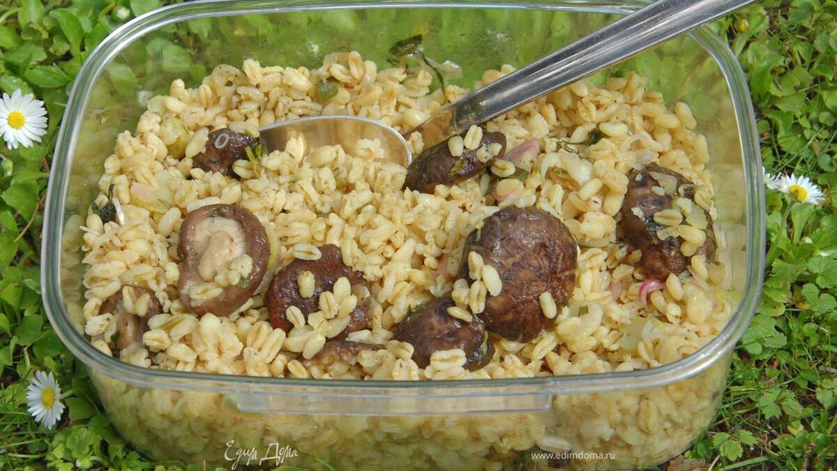Горячую пшеницу соединить с обжаренными грибами, луком и чесноком, посолить, поперчить, добавить заправку с луком и сельдереем, полить все оливковым маслом Extra Virgin, посыпать измельченным тархуном и перемешать.