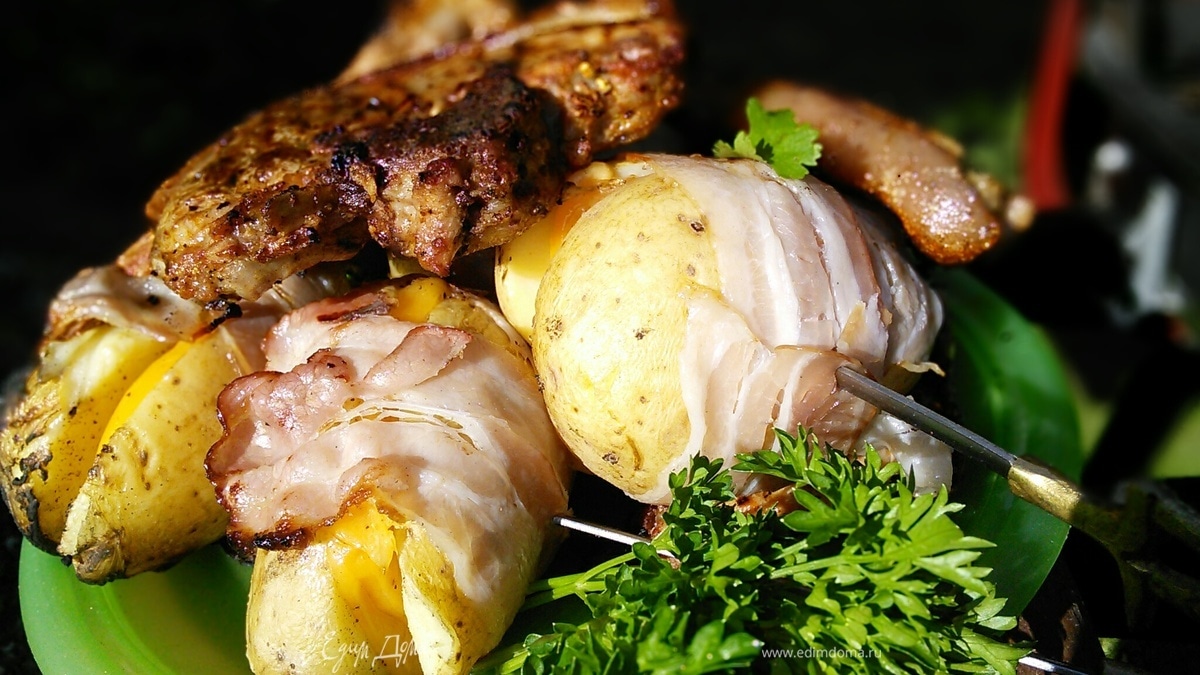 В бекон можно обернуть разнообразные продукты. Они от этого только выигрывают. Бекон придает копченую нотку, сочность и вкусность блюду. Сегодня я хочу показать рецепт картофеля, фаршированного сыром и обернутого в бекон. Блюдо готовится за несколько минут, особенно ценна простота в приготовлении на природе. Угощайтесь!