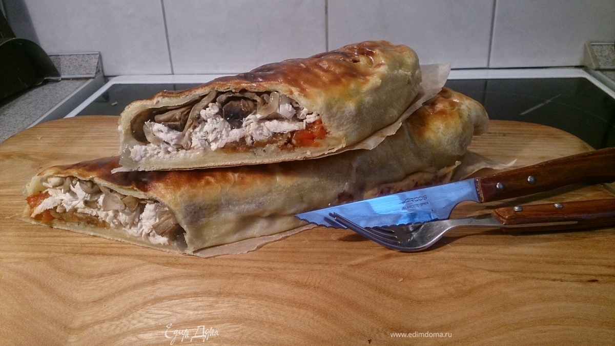 Могу сказать, что мне понравилось, да и друзьям тоже (см. предыдущий рецепт), так что будем экспериментировать дальше! Тесто у меня готовое, слоеное бездрожевое, и сегодня я попробовал смешать отварную куриную грудку с жареными шампиньонами и луком, предварительно запеченным болгарским перцем, вяленым инжиром и голубым сыром. Сочетание оказалось весьма удачным и вкусным. Тесто, как и впрошлый раз, получилось хрустящим и ароматным, да и начинка была просто восхитительная. Аромат жареных грибов, печеного перца, сладость инжира и пикантная нотка голубого сыра, сделали свое дело. Друзья просто смели этот штрудель, так что я сам еле успел его попробовать. Давайте начнем готовить, и надеюсь, что этот рецепт придется вам по душе и по вкусу!