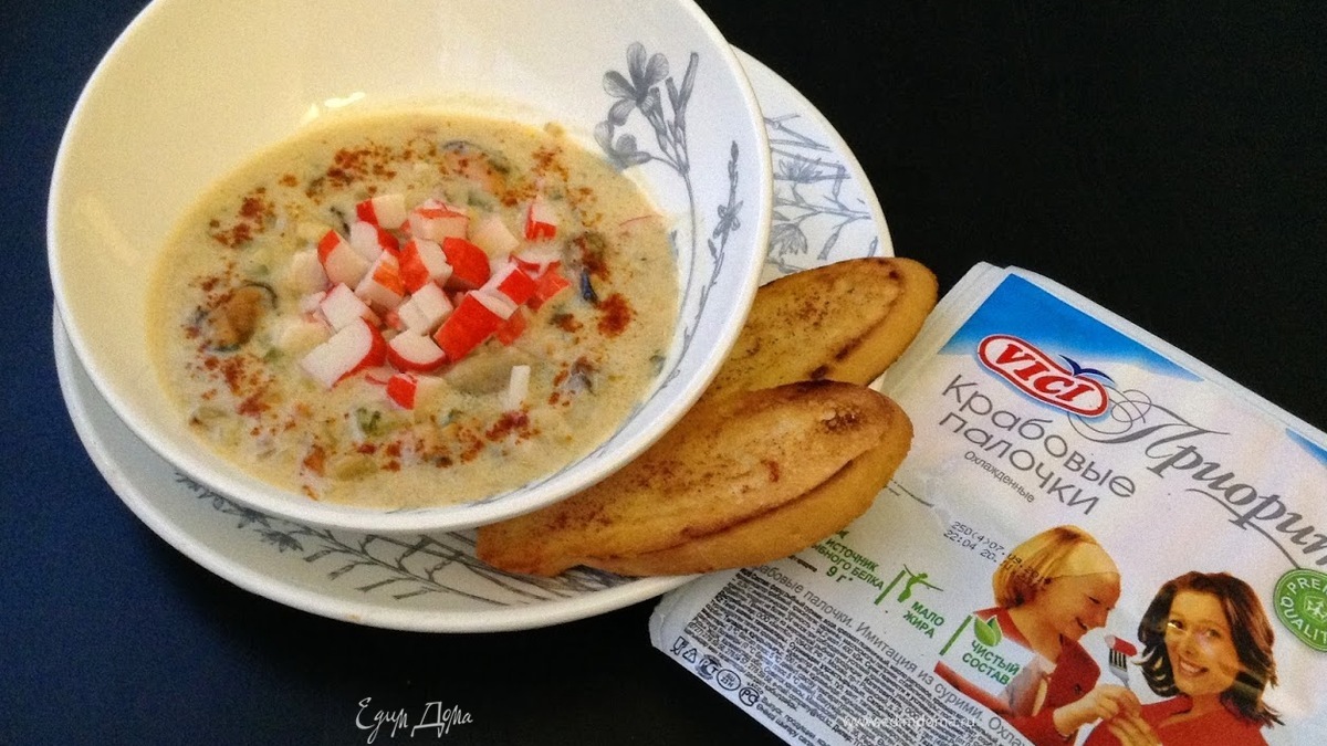 Разливаем чаудер по тарелкам, в центр тарелки выкладываем горкой кубики крабовых палочек, посыпаем молотым красным перцем и сервируем подрумяненными кусочками багета. Приятного аппетита!