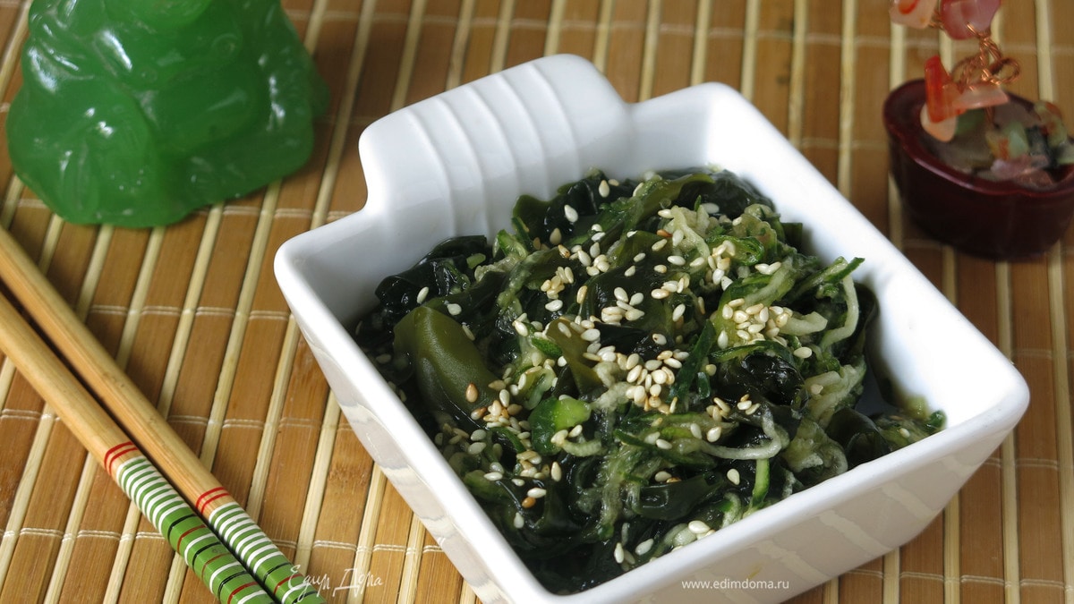 Подготовим огурцы, соль, сахар, соевый соус, рисовый уксус, кунжут. Факультативно — водоросли вакаме (можно добавить имбирь свежий, масло кунжутное). - Шаг 2