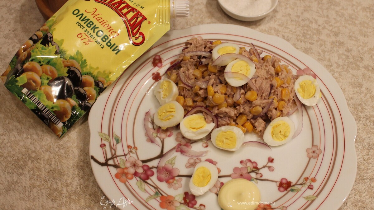 Для приготовления салата «Предновогодняя легкость» я использовала следующие ингредиенты: тунец консервированный, яйца перепелиные (домашние), лук красный, соль и перец черный молотый, кукурузу сладкую и, конечно, майонез №1 в России ТМ «МахеевЪ». - Шаг 2