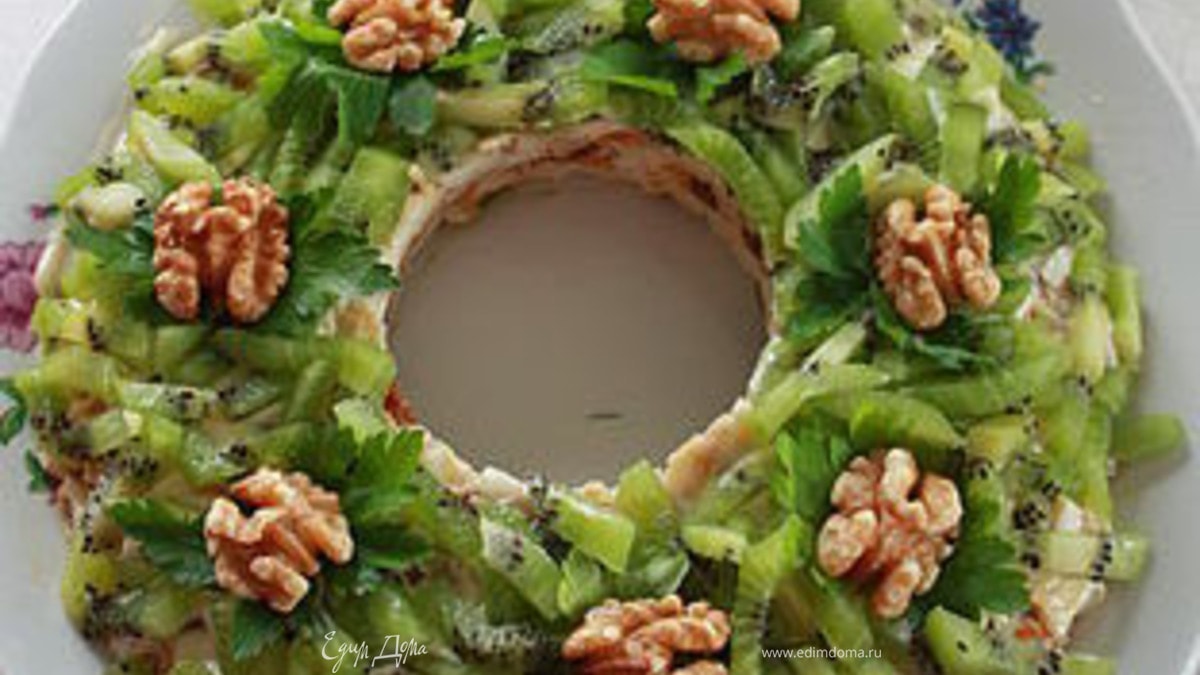 - Шаг 1Яйца отварить и мелко порубить. Морковь натереть и обжарить в подсолнечном масле. Изюм прокипятить 10 мин. Орехи порубить. Все вместе перемешать при этом посолить поперчить. Добавить натертый сыр и измельченный чеснок. Заправить майонезом. На блюдо поставить стакан и выложить вокруг него салат. Присыпать ломтиками киви и орехами, украсить зеленью. Убрать стакан и подавать на стол.