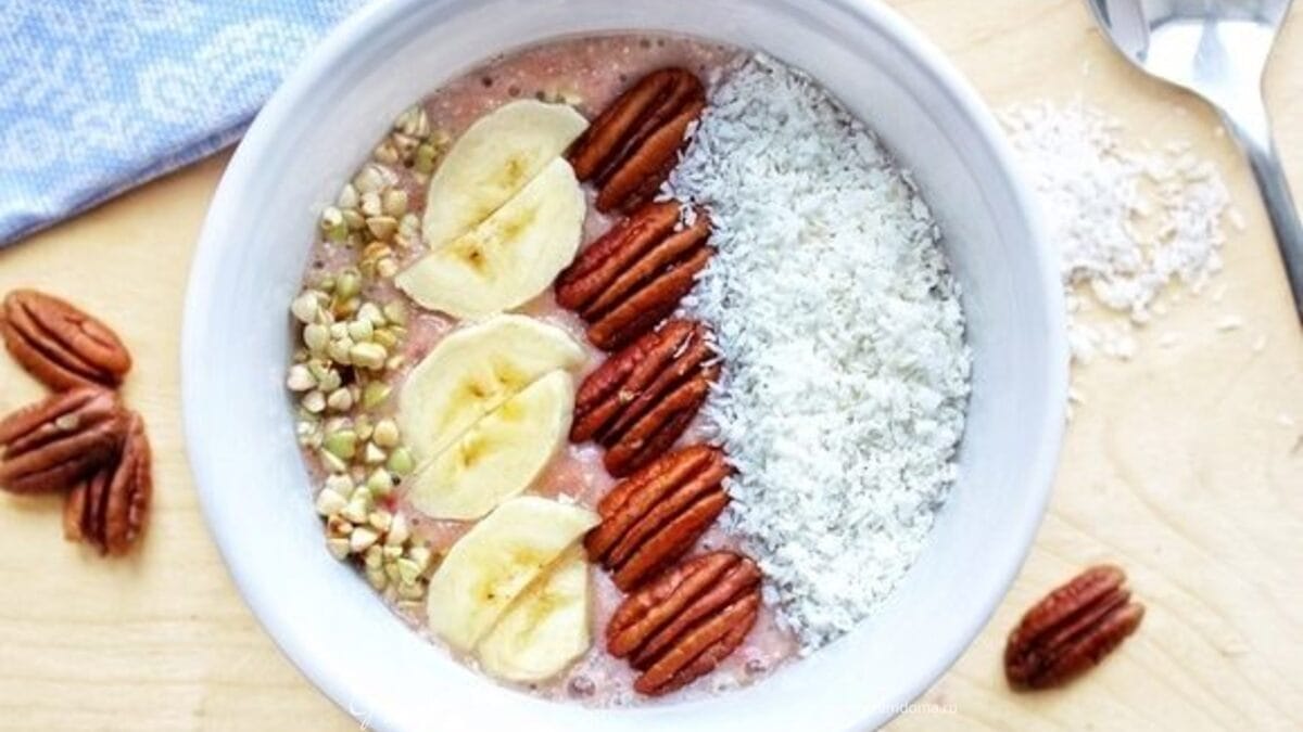 Для топпинга используем продукты, исходя из своих предпочтений. В составе для топпинга в этом рецепте орех пекан, банан, кокосовая стружка, зеленая гречка.