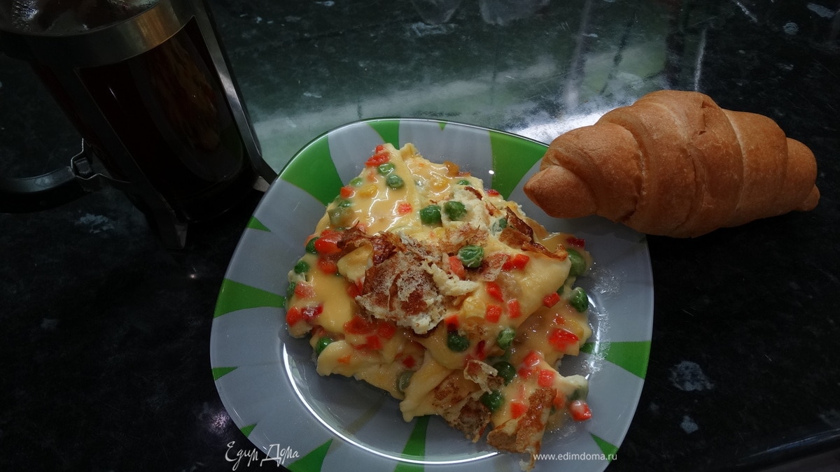 Добавить омлет к овощам и жарить 5 мин. Края подхватывайте, чтобы омлет схватился. В конце можно украсить сыром. - Шаг 4