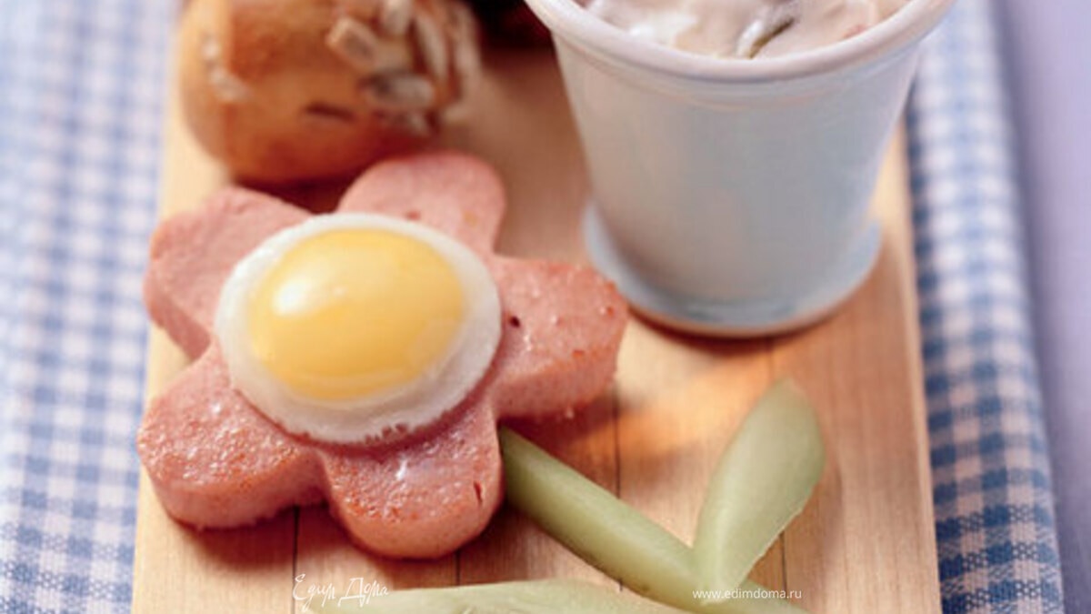 - Шаг 1Лепестки надо фигурно вырезать из докторской колбасы, сверху выложить аккуратную яичницу-глазунью, а стебелек можно выкроить из соленых или свежих огурцов.
