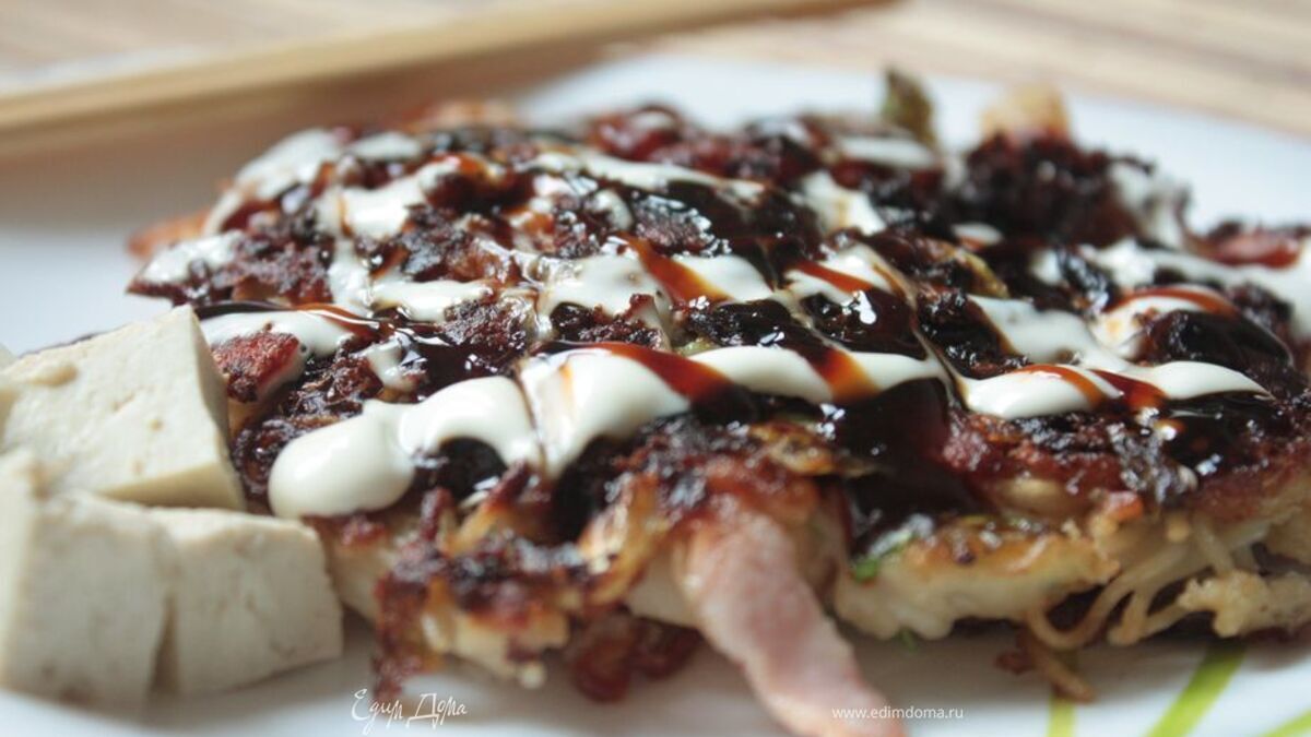 Готовое окономияки выкладывайте на тарелку и поливайте майонезом и соусом терияки или унаги. И наслаждайтесь!
