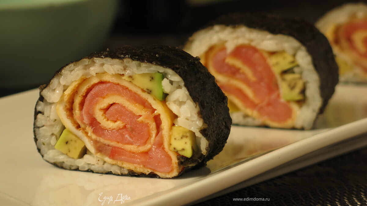 Суши розы — суши с омлетом и красной рыбой, на разрезе получается цветок. Приятного аппетита!