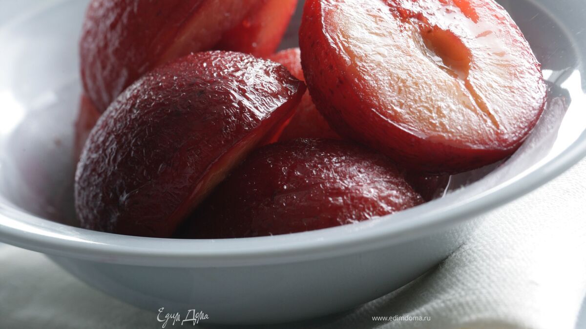 - Шаг 1Сливы разделить на половинки и, удалив косточки, уложить в антипригарную посуду.