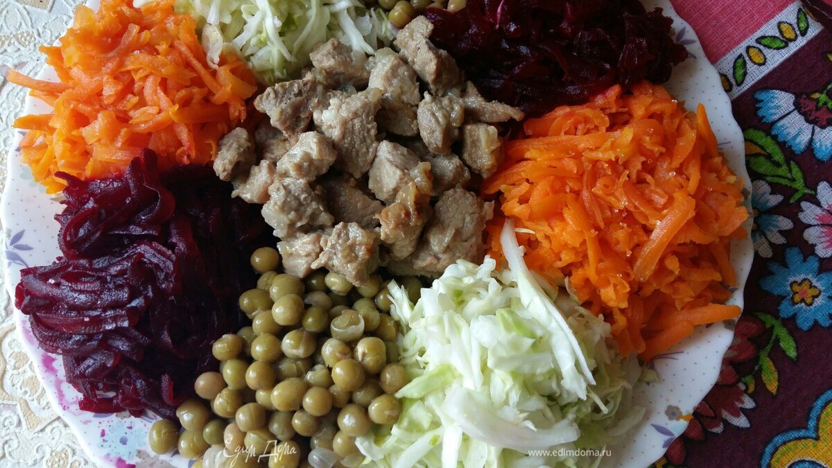 Откроем баночку горошка и выложим по кругу все овощи, чередуя в определенном порядке, какой нравится вам. Мясо выложим в центр. - Шаг 9