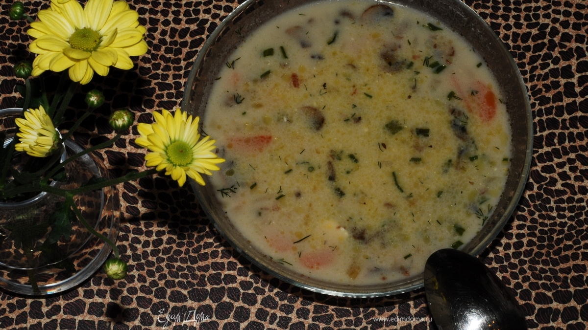 - Шаг 11. Выбираем нужный компакт-диск. В моём случае это был новый альбом MGMT с чудесным названием “Congratulations”. Прекрасная работа, на мой вкус, но не включайте диск при готовке, если до этого вы не уделили ему должного внимания. 2. В кастрюлю (т.к. мой рецепт рассчитан на два литра, хорошо подойдёт трёхлитровая кастрюля) зальём кипяток или же холодную воду и вскипятим её. Посолим воду. Когда вода закипела, закидываем в неё картофель, порезанный кубиком (возможны варианты). 3. Когда картофель почти готов, засыпаем гречку. Промойте гречку, прежде чем использовать, несмотря на то, что производители утверждают, что мыть её совсем-совсем не нужно! 4. Грибы, морковь и лук почистить и нарезать. Будет приятнее, если лук порежете мелко, грибы и морковь немного крупнее, хотя всё зависит от вашего вкуса, что безусловно! Я люблю нарезать морковь покрупнее, чем это делают обычно, но если готовлю для своей любимой, то удовлетворяю все её хотения и режу всё мелко. 5. Обжариваем грибы, лук и морковь на растительном масле. Я жарю на оливковом масле Extra Virgin. 6. Когда гречка сварилась, добавляем в кастрюлю зажарку. 7. «Дружбу» порежем на несколько частей и добавим в суп. Теперь держим суп на слабом огне и постоянно помешиваем, пока всё в нём не подружится (пока сырок не растает). Я советую для этого рецепта использовать именно сырок «Дружба», потому что, например “Viola” это совсем не дружба, хотя бы в нравственном отношении, не говоря уже о консистенции и прочих характеристиках. 8. Пробуем суп на соль и «правим» его, если нужно. Добавляем мелко порубленную зелень и даём прокипеть минут пять. 9. Приятного аппетита и не будем забывать, что раз в сутки супчик должен быть в желудке!