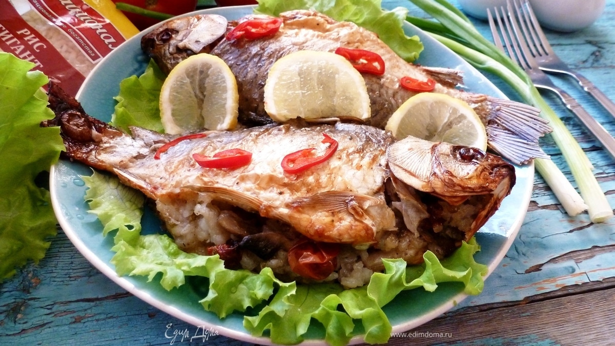 Всем любителям карасей предлагаю их запечь, нафаршировав вкусной начинкой из риса Гигант от ТМ «Националь», шампиньонов и вяленых томатов. Получается сочная и сладкая рыбка с гарниром.